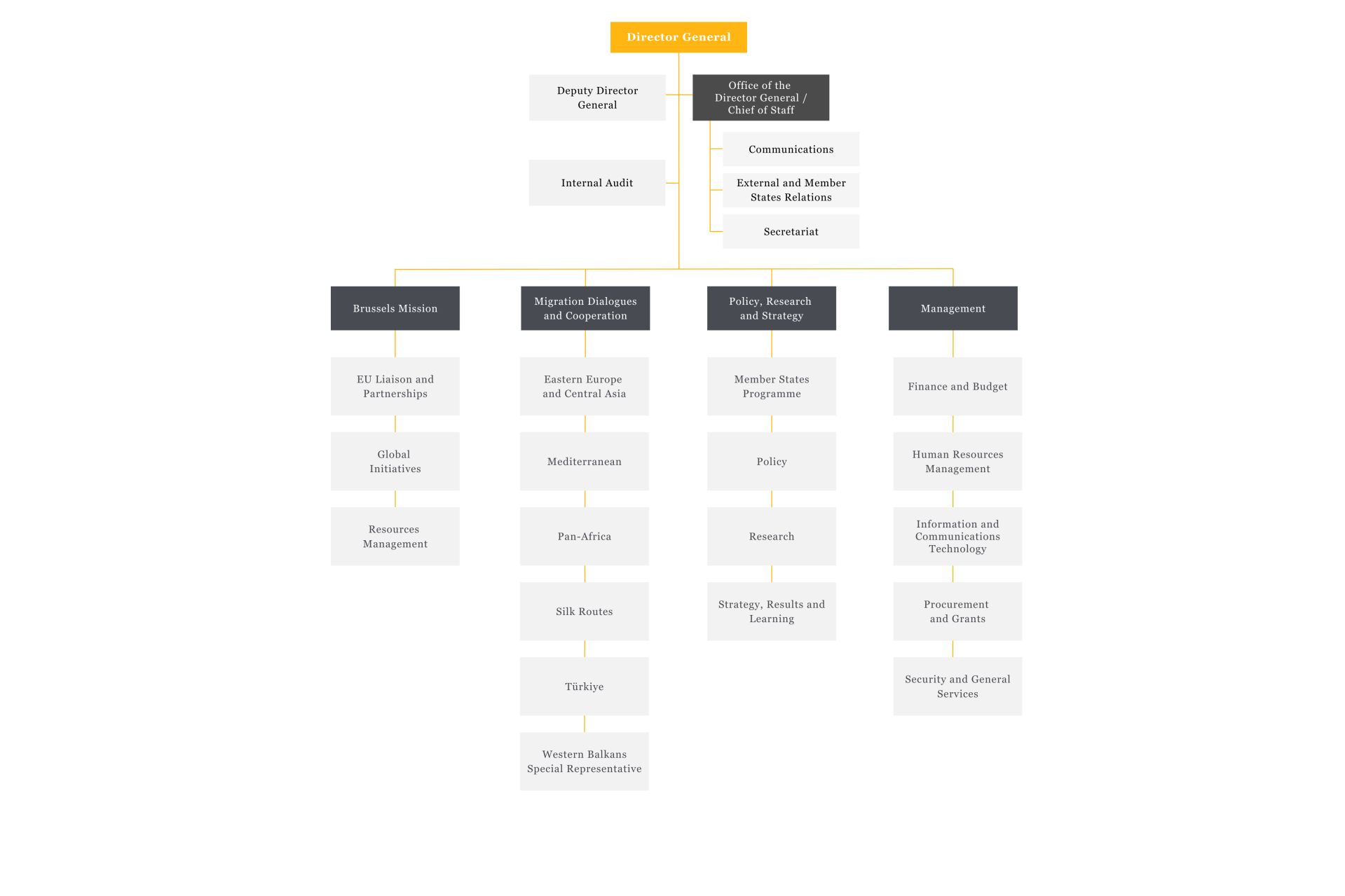 The organisation is led by the Director General, who is appointed by the Member States for a term of five years. The Director General is responsible for the overall leadership and management of ICMPD, ensuring that its work is aligned with the organisation’s mission and strategic goals.