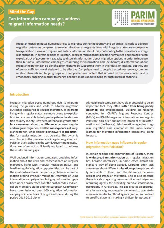 Irregular Migration Dynamics from Pakistan and the Role of Information Campaigns: PARIM Final Report. Vienna: ICMPD